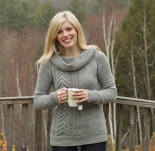 Alicia Plummer's DownEast pullover looks super cozy, with a big comfy collar.