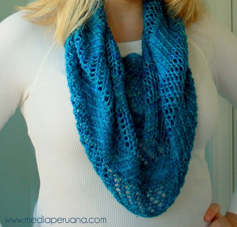 The Miraflores cowlet is available in two sizes: the S/M has a circumference of approximately 42", and the M/L is approximately 48" around. It's designed to fit snugly around your shoulders, like so: