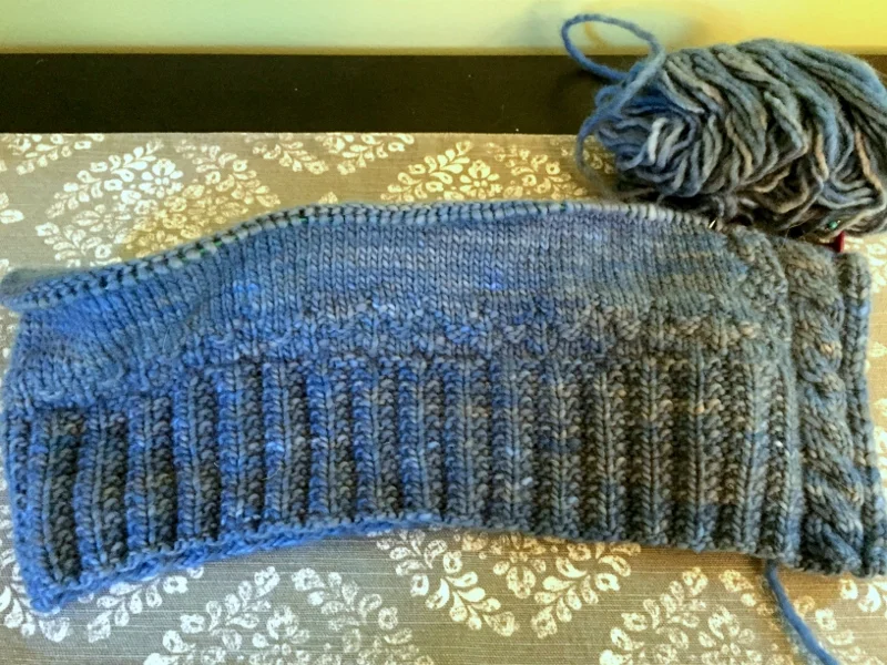 This is my oldest WIP--a Deep V Argyle Vest I started years ago (I want to say 2009), in now-discontinued Knit Picks Merino Style. I absolutely adore this vest, but I was a much less experienced knitter when I started it, and it's not without its problems. The floats are too tight, and I'm not confident blocking would improve them much. Not truly understanding pattern sizing and ease at the time, I chose to knit the 34" size, which back then would've given me 0 ease, and today negative (it is supposed to be close fitting, but you still need room for a shirt under it!). It's time to give up on this project. Maybe I can use the yarn for a colorwork project for one of the boys--JJ does seem to love purple.