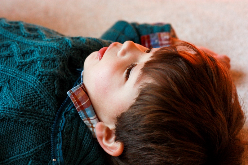 I started knitting on the suggested US 7 needles, but didn't like the fabric, so I dropped down to US 6. This also gave me a slightly smaller sweater that's a better fit for JJ--he's tall for his age, but skinny, so at not-quite-3, a true size 5 would've been too large.