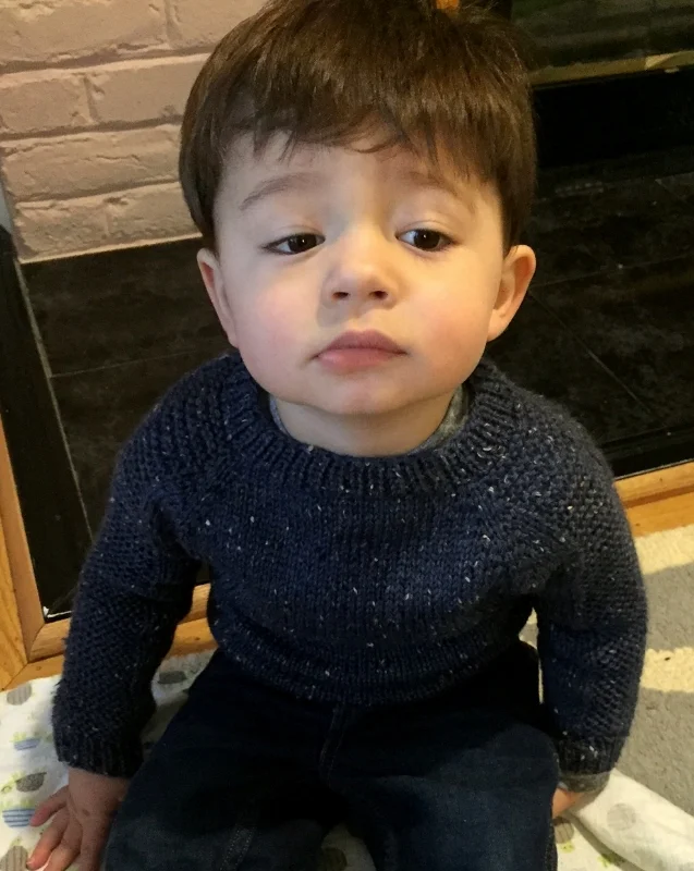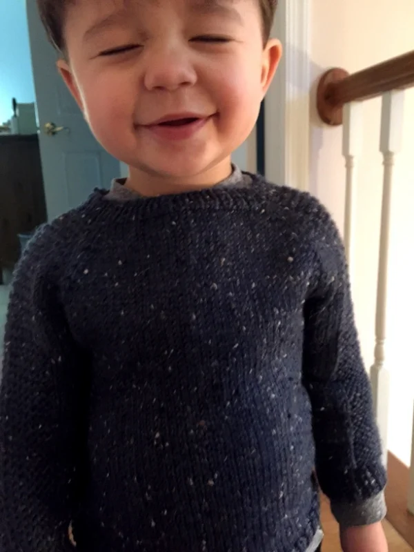 It knit up relatively quickly in Knit Picks Wool of the Andes Tweed and took juuuuuust a smidge over 3 skeins for the 2-4 year size. I made the usually terrible decision of not swatching because I've knit with WOTA enough to know my gauge, more or less, and was ok with the sweater coming out a bit smaller than the specified dimensions and it worked out, for once.