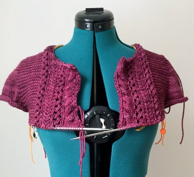 I've done the most complicated part--the provisional cast on and short row shaping for the shoulders--have separated the sleeves and am ready to start the waist shaping. But I still have a fair bit of knitting to do--most of the body, both sleeves up to the armholes and the collar.