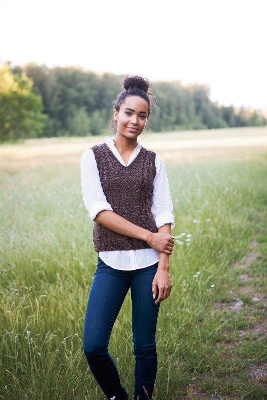 The Vaughan Vest is a v-neck, featuring columns of winding cables framing a panel of woven-style textured stitches, which is repeated on the back. It's finished with simple ribbed hems.