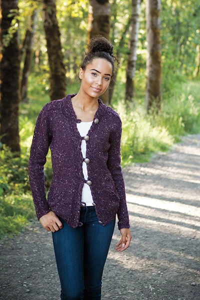 Cassie Castillo's Liana Cardigan is a seamless, saddle-shoulder cardigan that certainly deserves space in your sweater drawer. To be honest, I think the dark, tweedy yarn chosen for the sample obscures some of the noteworthy design elements in this piece. Chunky cables trim the front bands and collar, as well as the slant pockets--which you can barely see! I love the loop button closures on this one too.