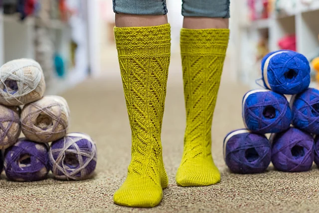 The Electrostatic Lines socks, by Jennifer Raymond, made the cover and they are absolutely stunning. And knee socks! I wish I had more knee socks in my life. The pattern includes an impressive 6 sizes, as well as notes on calf-sizing and ensuring a good fit.