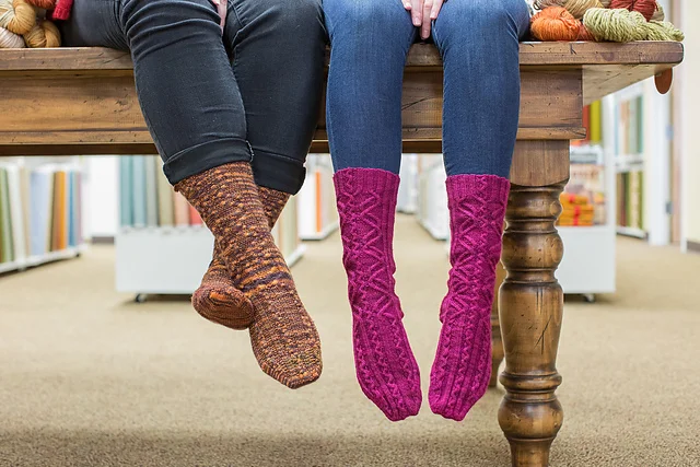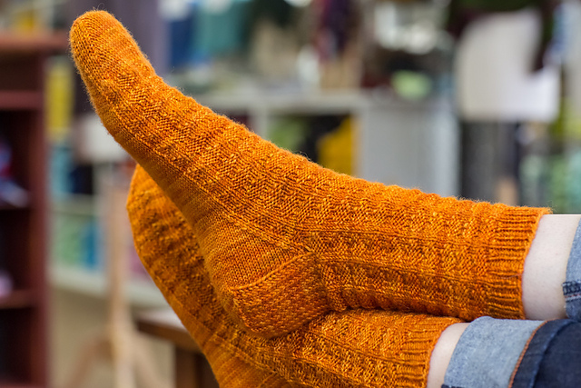 The Hominy Socks by Marie Godsey are textured, top down socks that would work with a variety of colors, from solid to variegated. They're also noted as a good introductory pattern for new sock knitters. My only quibble with that is that the pattern only includes one size. With a 6-stitch pattern repeat, adding additional sizes should not be too difficult, but is probably an exercise best left to more experienced sock knitters.
