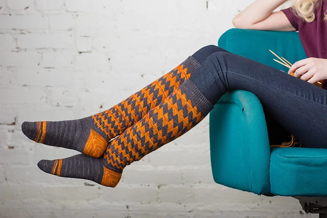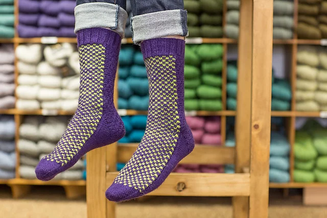 The Checkers Socks, by Mone Drager--this is a "wow" pattern! There's a lot going on here, but it really works together. The construction on these socks is more complicated than your traditional sock, with the back of the leg and sole worked flat first, and then the front of the leg and top of the foot attached while knitting. This is probably not TV knitting, but worth the extra effort for a unique pair of socks.