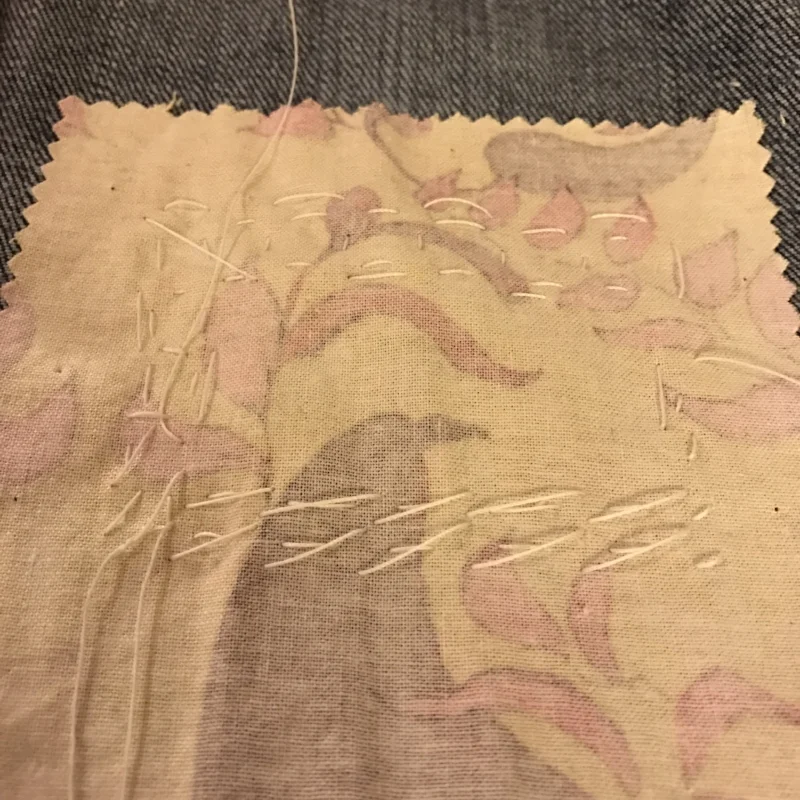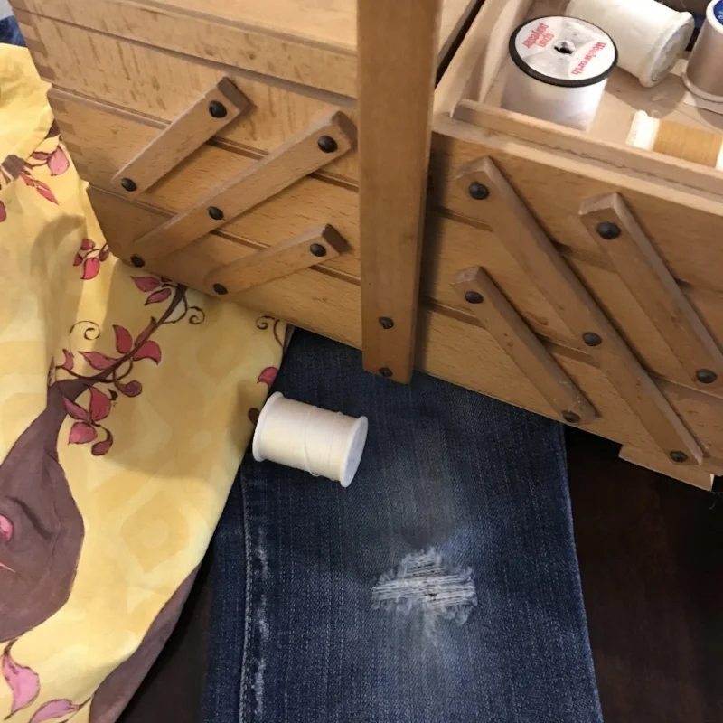 When this little hole sprung up, I decided to tackle it before it grew out of control. I'd seen some interesting pins about visible mending on Pinterest and decided to give it a go. I got out my mom's sewing box, found some sturdy white thread and the pinking shears.