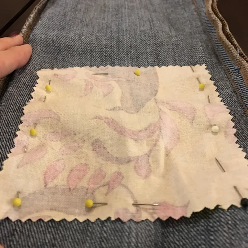 I pulled this adorable skirt out of the Goodwill pile--it had never fit right and so I'd decided to donate it, but then realized I could reuse the fabric for other projects. I cut out a big square and pinned it into place on the inside of my jeans.