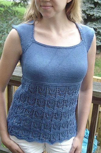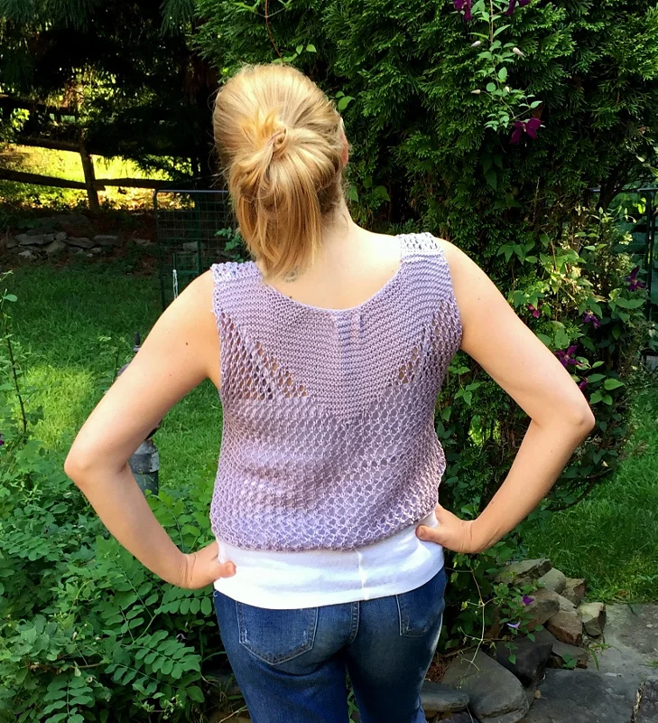 The Lotus Blossom tank is one of the first garments I ever knit, and I still wear it every summer. With a solid top and lacey body, it gives you coverage where you need it, and cool breezes too!