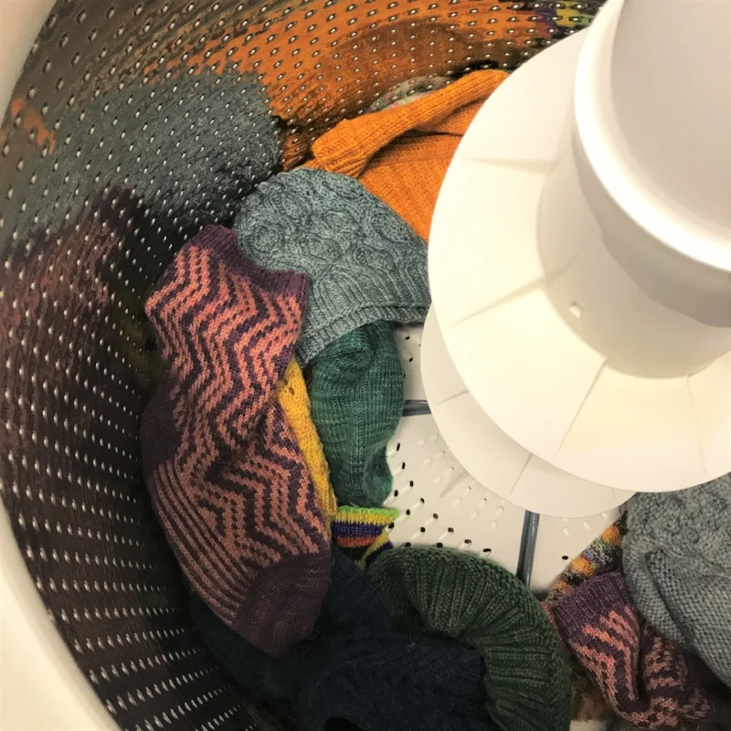 Then it's time to clean everything up. My washing machine has an "ultra handwash" cycle that I've been eyeing with suspicion, but I recently gave it a shot after Ollie threw hummus on my Monte Rosa cardigan (note: he did not actually eat the hummus). I was pleasantly surprised to see my sweater come out neat and clean, no felting or shrinking, just like handwashing. So I'm using the machine now, with some reservations--only on superwash wool, and nothing super delicate. Anything that can't go in the machine soaks in a big tub with an earth-friendly biodegradable wool wash that I can dump out outside. Some of my favorite cleansers for my handknits are Eucalan and Unicorn Fibre Beyond Clean.