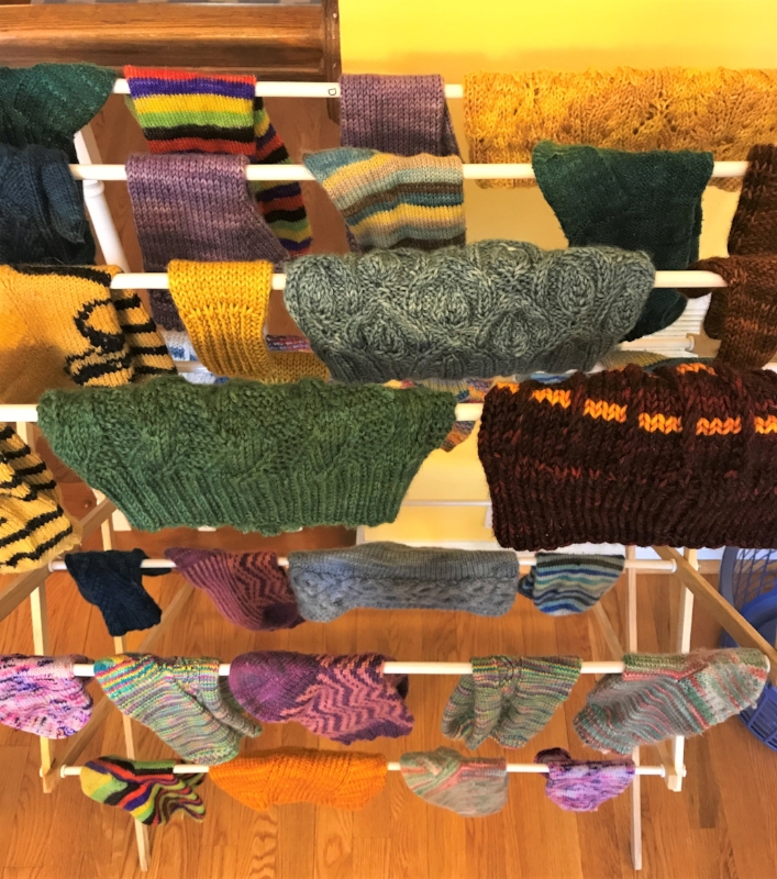 Then, drying. I don't throw anything in the dryer, even if the yarn care label says it's ok--when JJ was a baby I tried machine drying my socks to save time, but they suddenly started wearing out much faster, and that was the end of that. It's a lot easier to air dry them and wait a day than it is to knit brand new socks!