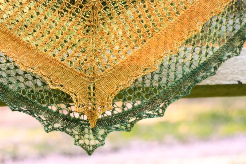 Designed for fingering weight yarn, any sock yarn in your stash will surely make a beautiful shawl, but it really shines in a light-as-air single ply yarn. The yellow shawl is worked in Lakes Yarn and Fiber Silk Single fingering, a merino/silk blend with gorgeous sheen. The green uses Skeinny Dipping Merino Single, super soft and fantastic drape. I would also recommend Shalimar Yarns Aerie, Knit Picks Preciosa Tonal or Chroma fingering, or Hedgehog Fibres Skinny Singles. Because single ply yarns sometimes have more yardage per skein than plied sock yarns, the pattern includes 2 sizes--no yarn goes to waste!
