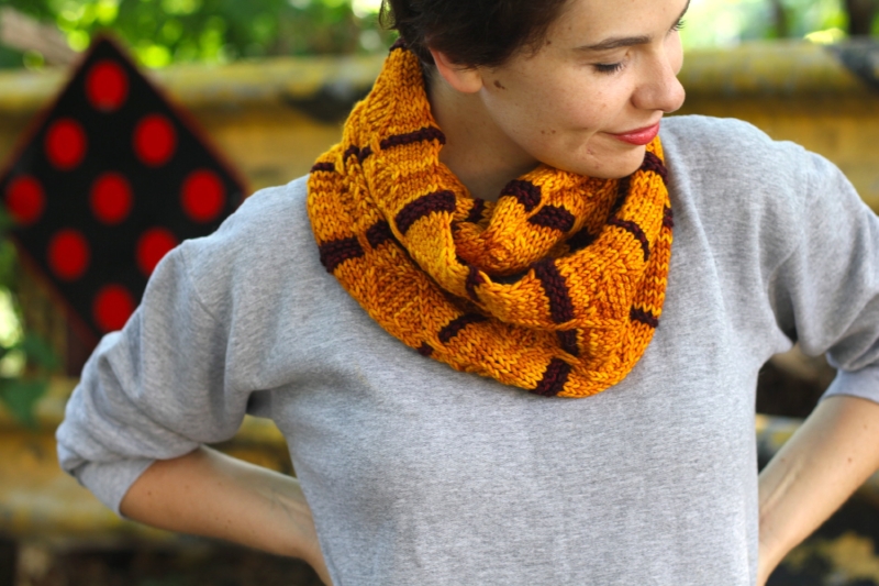 Sometimes you want something understated--and sometimes you want just the opposite. This scarf has a lot going on, combining some of my favorite design elements: cables, stripes, and garter stitch. It knits up FAST in a chunky weight--I got another chance to work with my favorite Baltimore-based dyer, Neighborhood Fiber Co!--and is so toasty warm.