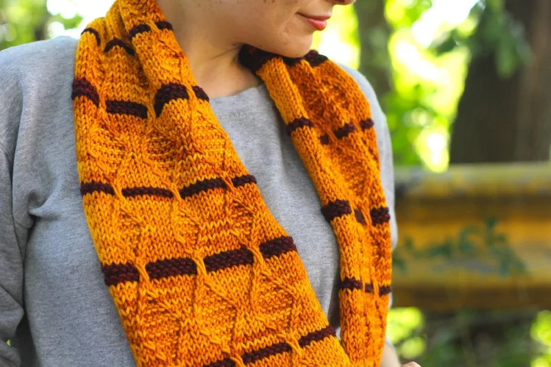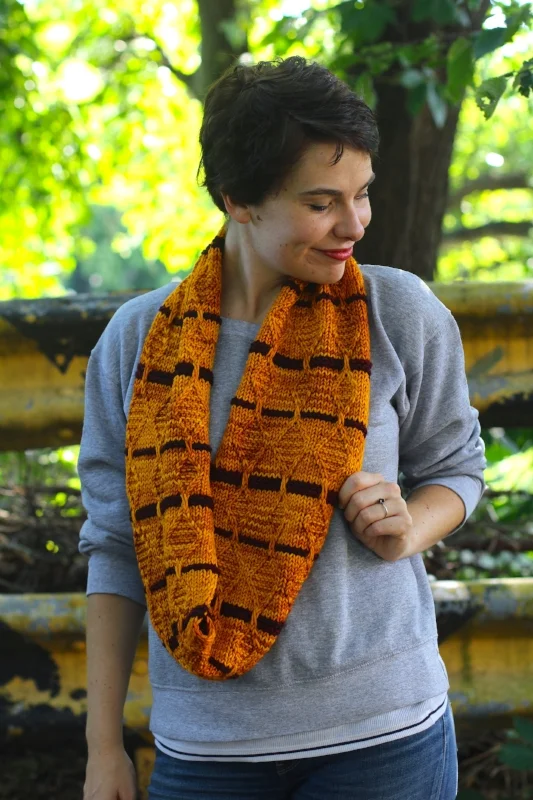 It starts from a provisional cast on, and uses elongated (double wrapped) stitches to easily pull the cables across the contrast stripes. Slipped stitches on either side give it a neat edge, and a quick Kitchener Stitch when you're done gives you an infinity scarf that can be worn long to show off the details or double wrapped for extra warmth.