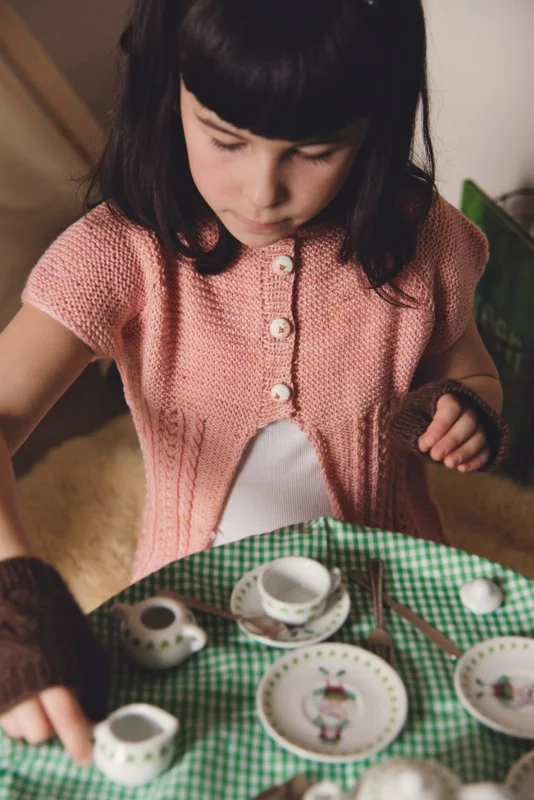 First, Evangeline: a sweet girl's cardi with a garter stitch yoke, simple cable-and-eyelet patterning on the body, open front and short sleeves.
