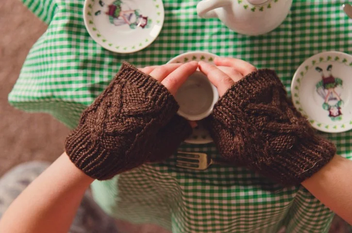 The Corteza ("bark") mitts feature an offset tree-branch cable and simple slipped stitch pattern. They're knit in Stitch Sprouts Yellowstone, a sport weight yarn with silk that gives it a hint of sheen.