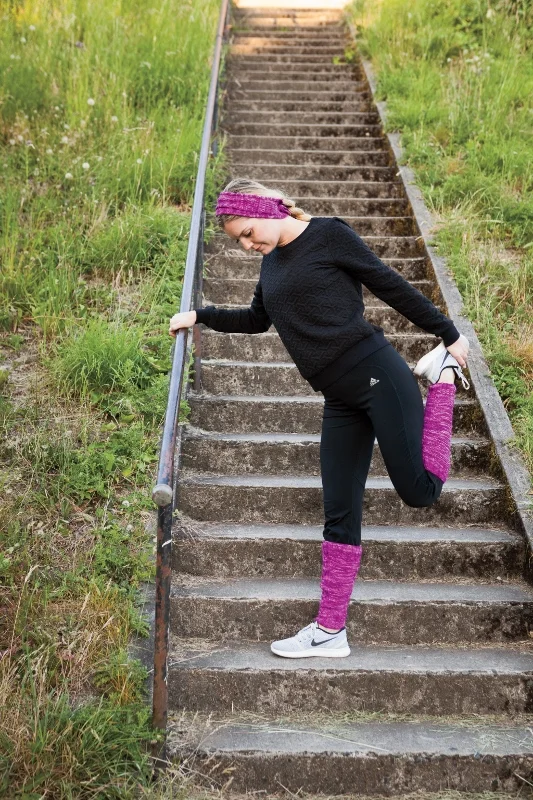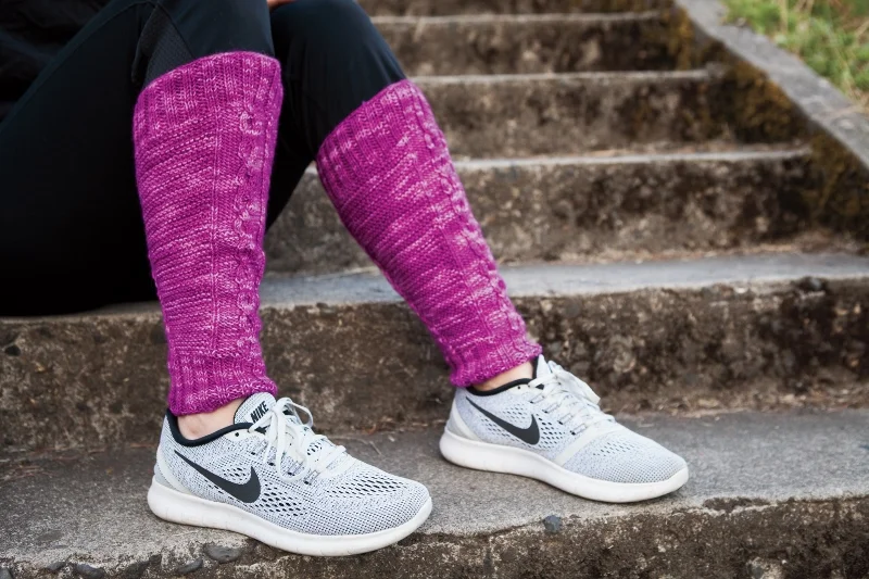 The legwarmers come in 3 sizes, and of course, you can knit them as tall or short as you like. Legwarmers are another piece that's great for outdoor activity--you don't want bulky, wooly socks scrunched up in your running shoes making your feet sweat, but you do want some warmth on your legs! They slip on easily over leggings and can help cover up that pesky gap you get between the tops of your shoes and the hem of your pants.
