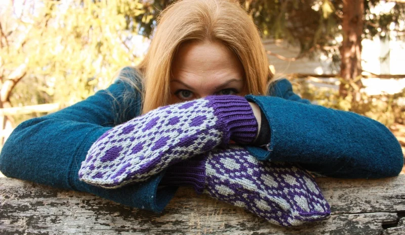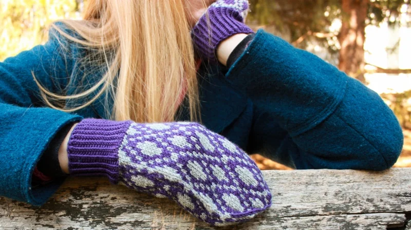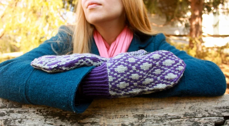 This pattern is a great opportunity to play with color! Use 2 solid colors, a solid and a variegated, or a solid and a self-striping. Make matching mittens, or reverse your main and contrast colors on the second mitten to create the positive/negative effect shown in the sample.
